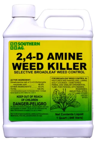 Low, economical use rate of 1 to 4 pints per acre Controls many broadleaf weeds & woody plants Use in turf, pastures, rangeland, ditch banks, fences… CONTAINS: 3.8 lbs. per gallon 2, 4-D acid equivalent liquid concentrate in a low volatile amine form. USE ON: Certain grasses in lawns, parks, golf courses, and pastures; fences, ditch banks, non-crop sites, small grains, and corn (pre and post emergent herbicide) CONTROLS: Many broad-leaf weeds. See list on label. RATE: 2- 3 tablespoons in 3 – 5 gallons of water to cover 1,000 sq. ft. APPLICATION: Apply as a coarse low pressure spray, preferably with fan type nozzle.