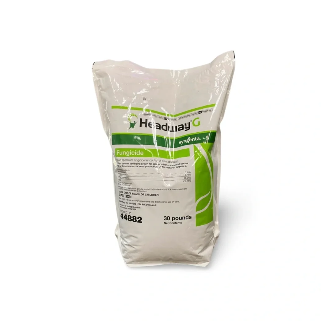 Headway G Fungicide (30lb) provides long-lasting broad-spectrum control on turfgrass diseases. The Headway G carrier dissolves easily and quickly, and because light weight, spread over a wider area than traditional granules. The Headway G carrier does not stick to leaves, is not picked up with clippings and does not leave a residue on shoes. Controlled disease: pathogens causing foliar stem and root diseases, including mildews, molds and rusts Use on: golf course turf, athletic fields, parks, along with residential, commercial and industrial landscape areas